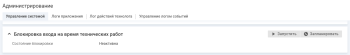 В блоке "Блокировка входа на время технических работ" отобразятся параметры: состояние блокировки "Активна" и даты/время старта (текущее время) и окончания технических работ.