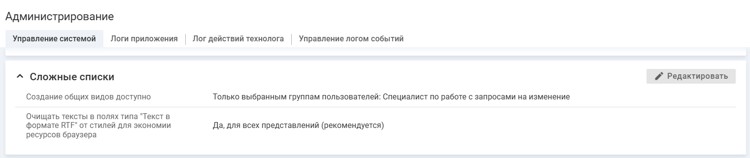 На странице "Администрирование" в блоке "Сложные списки" можно управлять параметрами работы со сложными списками.