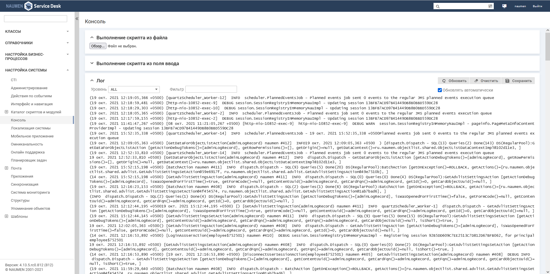 Раздел "Настройка системы" → "Консоль", страница "Консоль", блок "Лог".