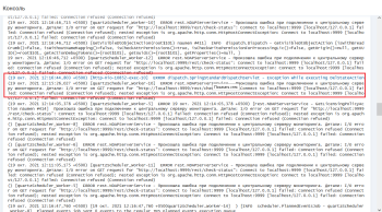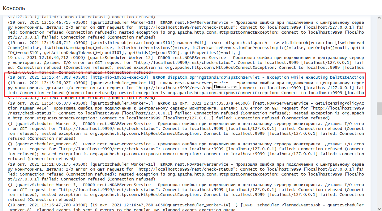 Сообщения лога с возможностью просмотра дополнительной информации об ошибке (стектрейсе ошибки в логе) выделяются синим цветом шрифта. По умолчанию дополнительная информация скрыта. При наведении курсора на данное сообщение, курсор изменяет свой вид и появляется подсказка "показать стек".