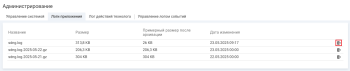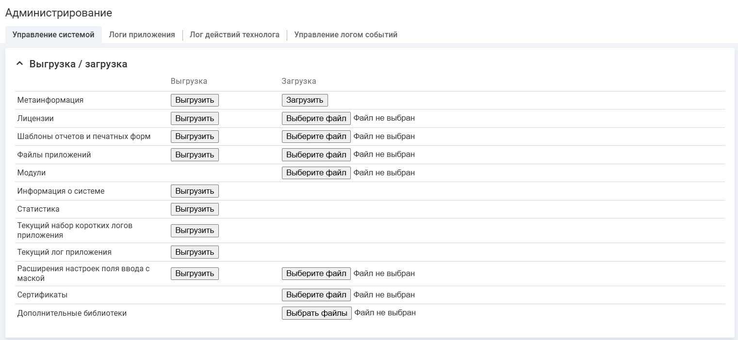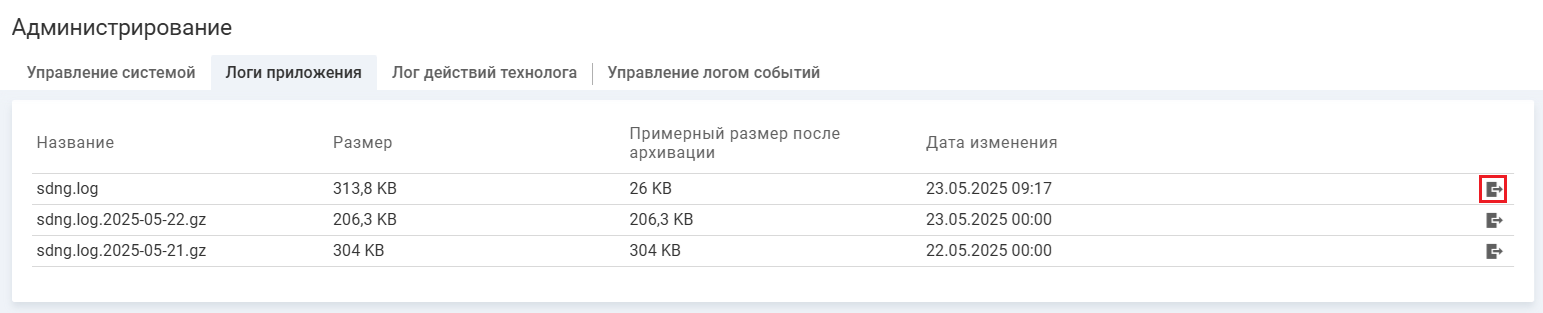 Экспорт (выгрузка) логов приложения через интерфейс администратора сокращает время на поиск причины возникновения ошибки, и может использоваться для получения логов через удаленное подключение к системе.