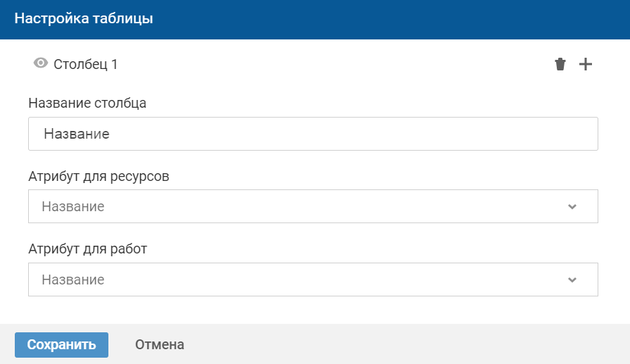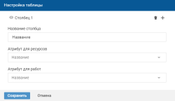- Атрибут для ресурсов — выберите атрибут класса/типа ресурса, который будет выводится для ресурсов в столбце таблицы. Для первого столбца используется значение атрибута с кодом title.