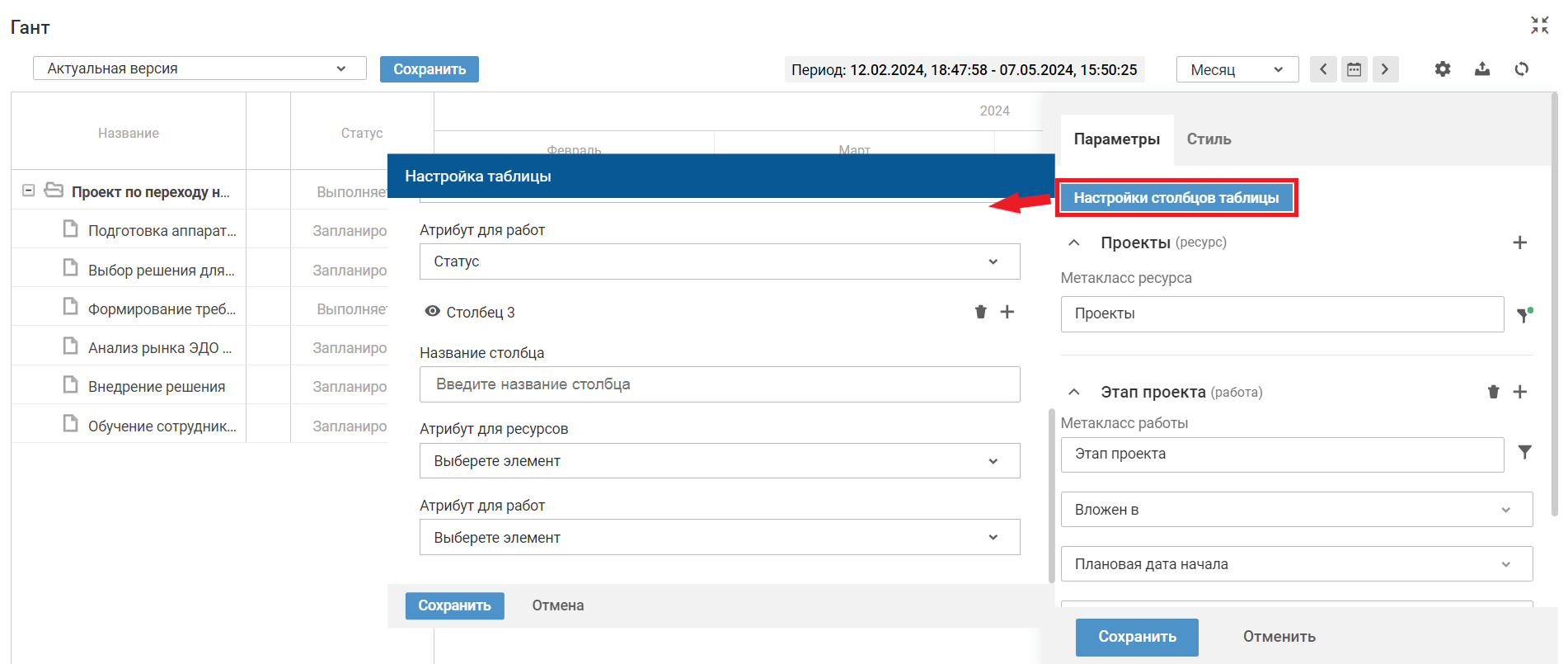 Настройка столбцов для ресурсов и работ