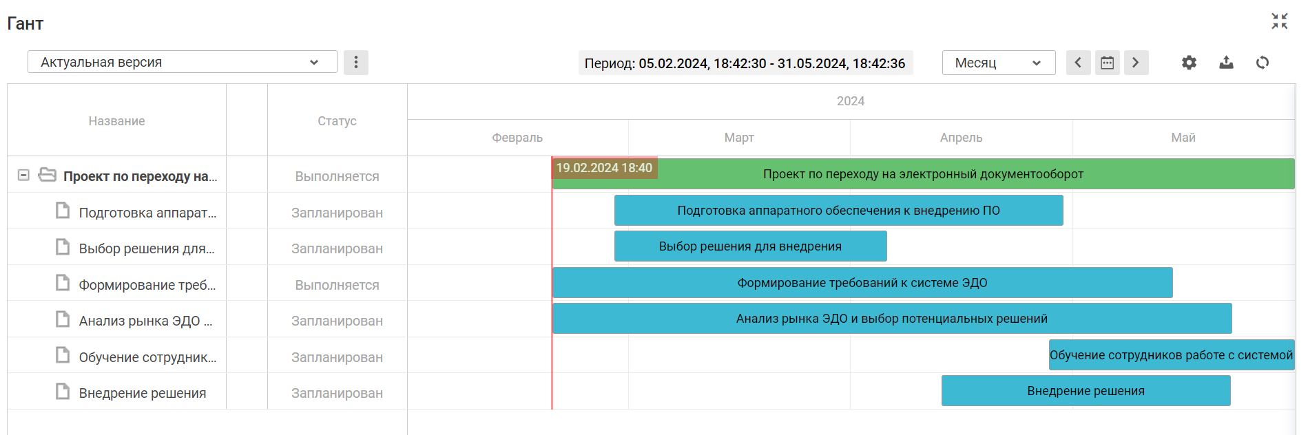 На диаграмме можно изменить состояние и срок контрольной точки. Чтобы изменить настройки контрольной точки, выберите контрольную точку, на форме редактирования внесите изменения и нажмите кнопку Сохранить.