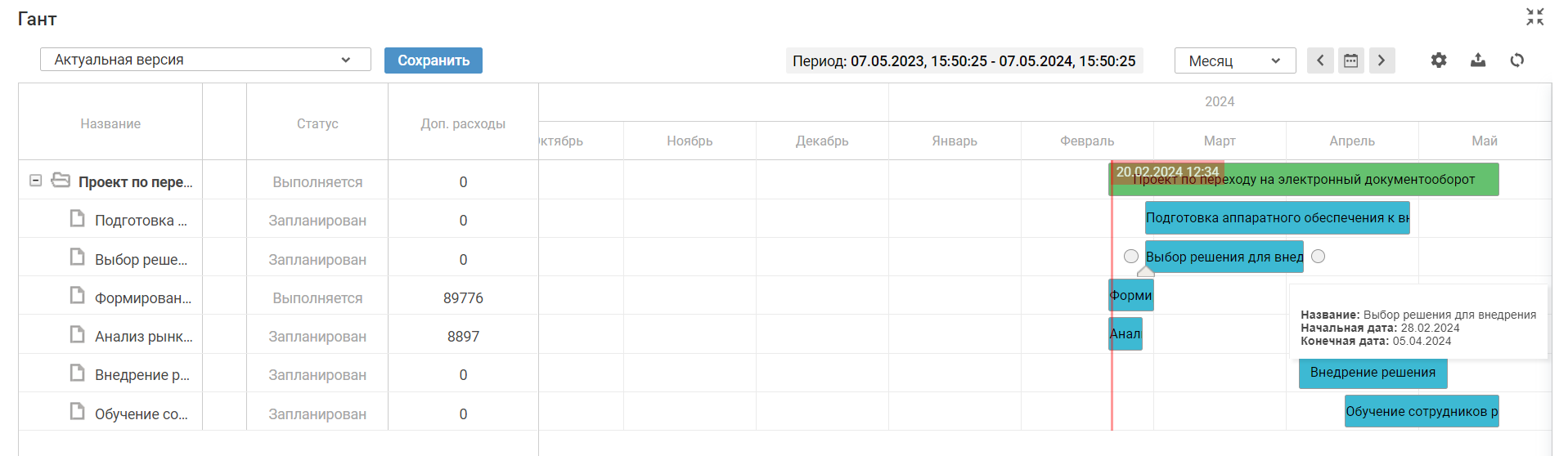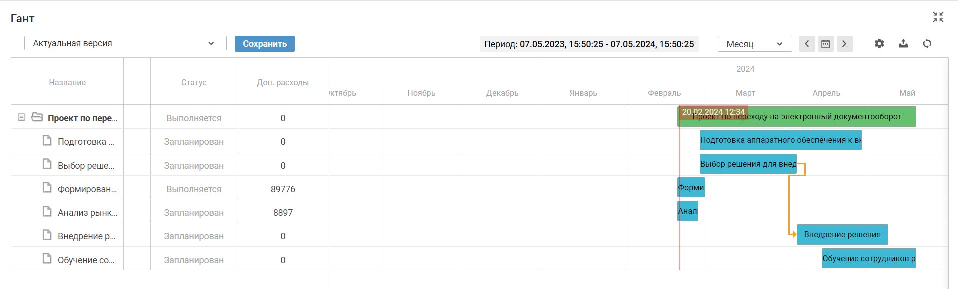 Для сохранения изменений по связям необходимо сохранить текущую версию диаграммы как актуальную. Подробное описание работы с версиями диаграммы приведено в разделе Работа с версиями диаграммы Ганта.