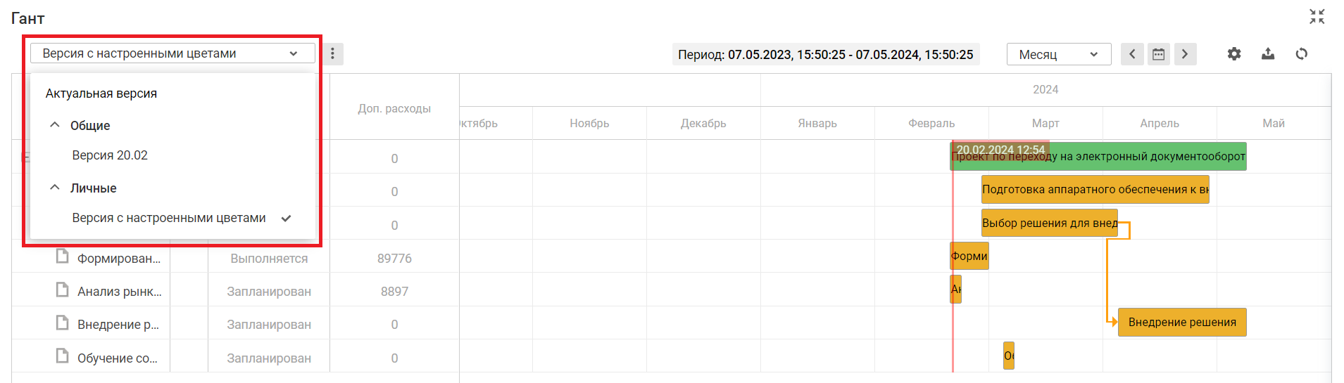 Пользователь может работать с конкретной версией диаграммы Ганта, которая была сформирована в результате выполнения пользовательских действий на диаграмме Ганта.