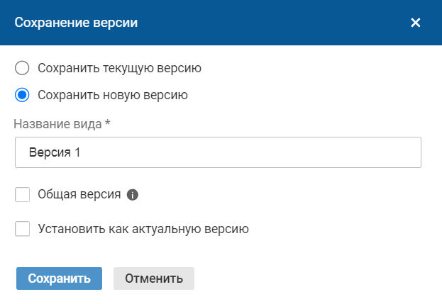 Нажмите на иконку рядом с полем выбора версии и выберите Сохранить новую версию. На форме сохранения версии установите флажок "Установить версию как актуальную" и в поле "Название вида" укажите новое название.