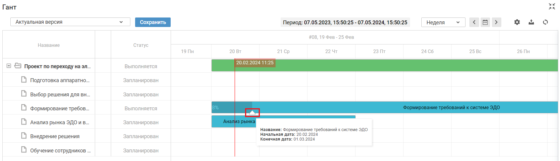 Чтобы изменения в датах начала и окончания работы не были потеряны, необходимо сохранить текущую версию диаграммы как актуальную. Подробное описание работы с версиями диаграммы приведено в разделе Работа с версиями диаграммы Ганта.
