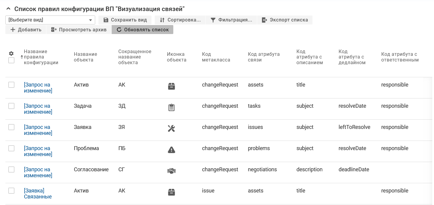 По итогам загрузки метаинформации в системе создается класс "Правило конфигурации ВП" и вложенный тип "Визуализация связей", а также справочник "Иконки для ВП "Мультиклассовый список связей".