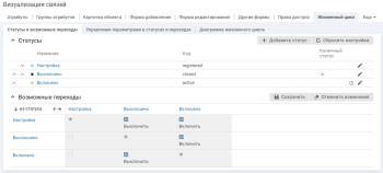 Статусы: "Настройка" (registred), "Включено" (active), "Выключено" (closed).