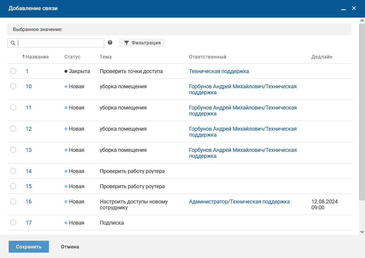 - Выберите объект и нажмите кнопку Сохранить, см. Форма добавления связи.