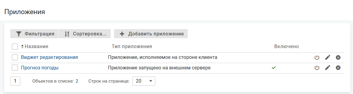- Параметры: название (является ссылкой на карточку приложения), тип приложения и текущее состояние: включено или нет (