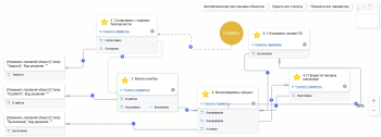 Карточки объединяются между собой стрелками. Стрелка соединяет между собой две карточки в виде "исходный шаг, из которого инициируется действие ← действие → целевой шаг, в рамках которого выполняется действие".