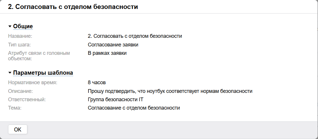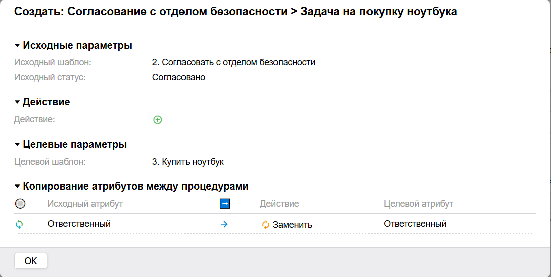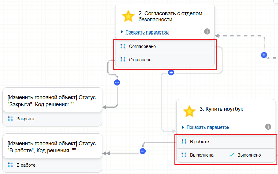 Блок с параметрами действия (статусами действия и кодами решения, относящимися к исходному и целевому шагу, отображается под карточкой.