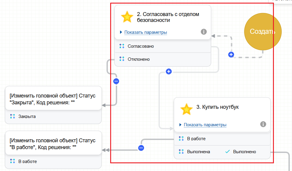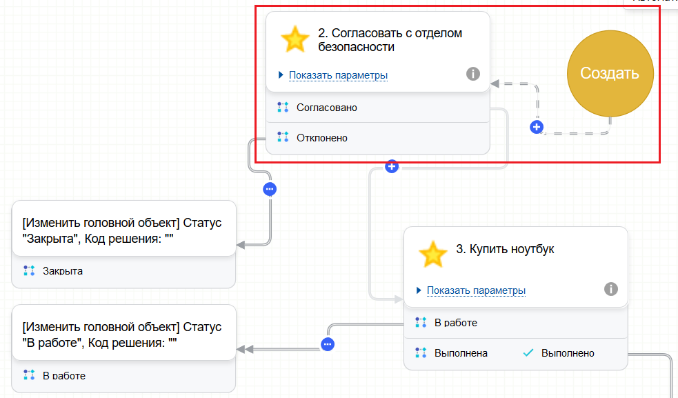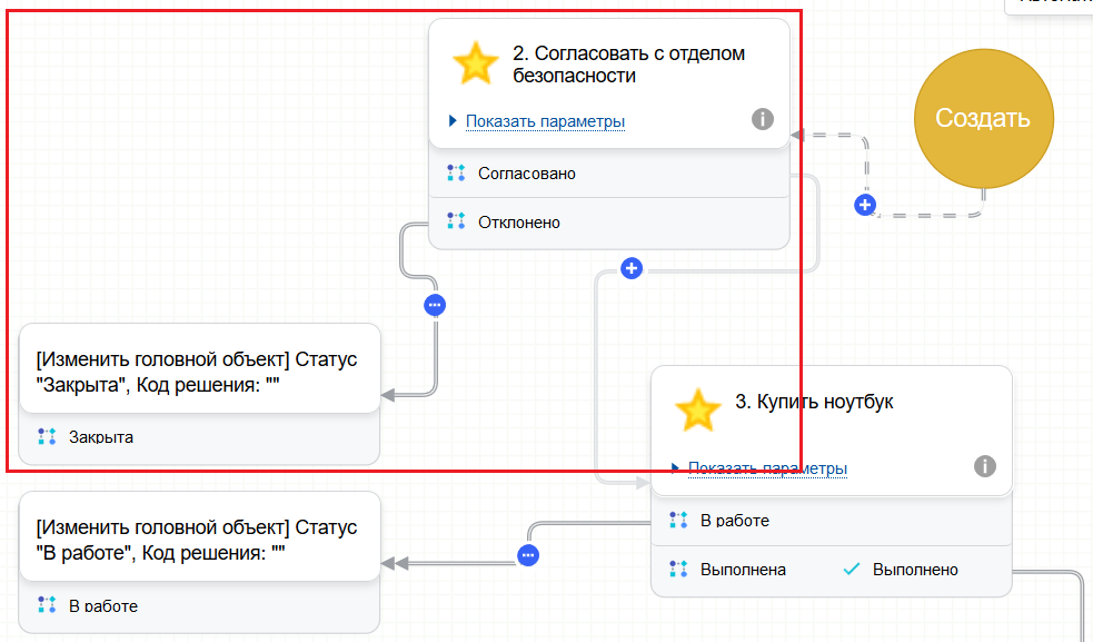 Под карточкой исходного шага отображается блок с параметрами действия, относящегося к исходному шагу, от этого параметра выходит стрелка и соединяется с карточкой целевого объекта.