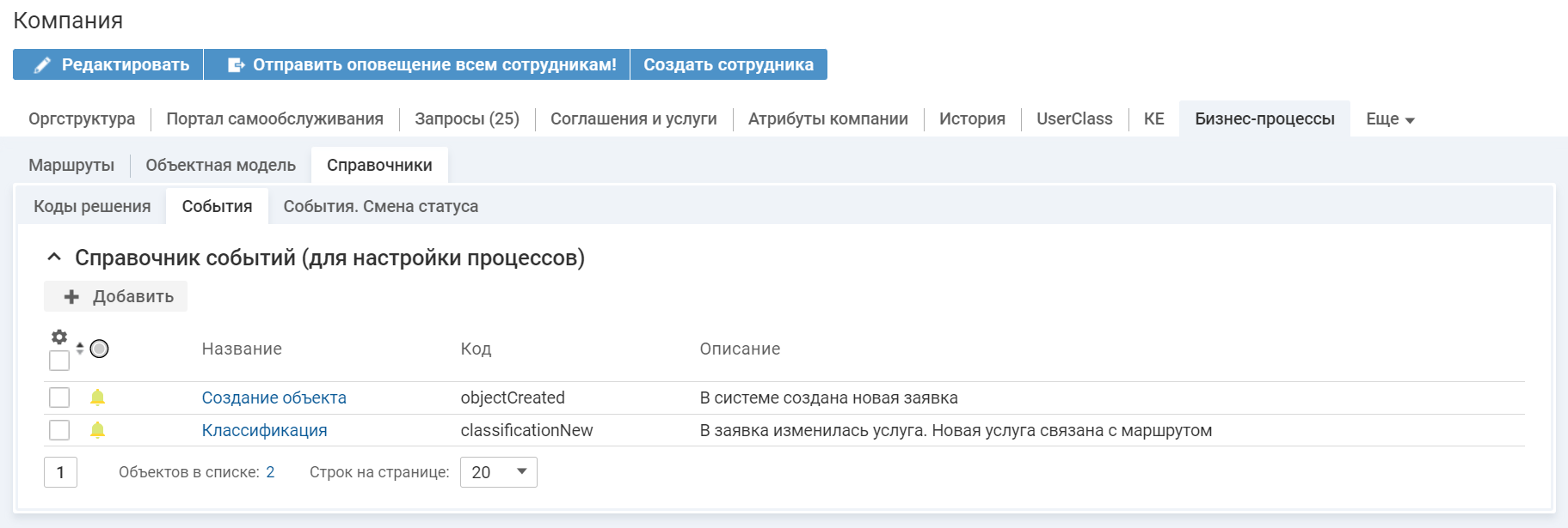 Интерфейс оператора. Вкладка "Бизнес процессы" → "Справочники" → "События".