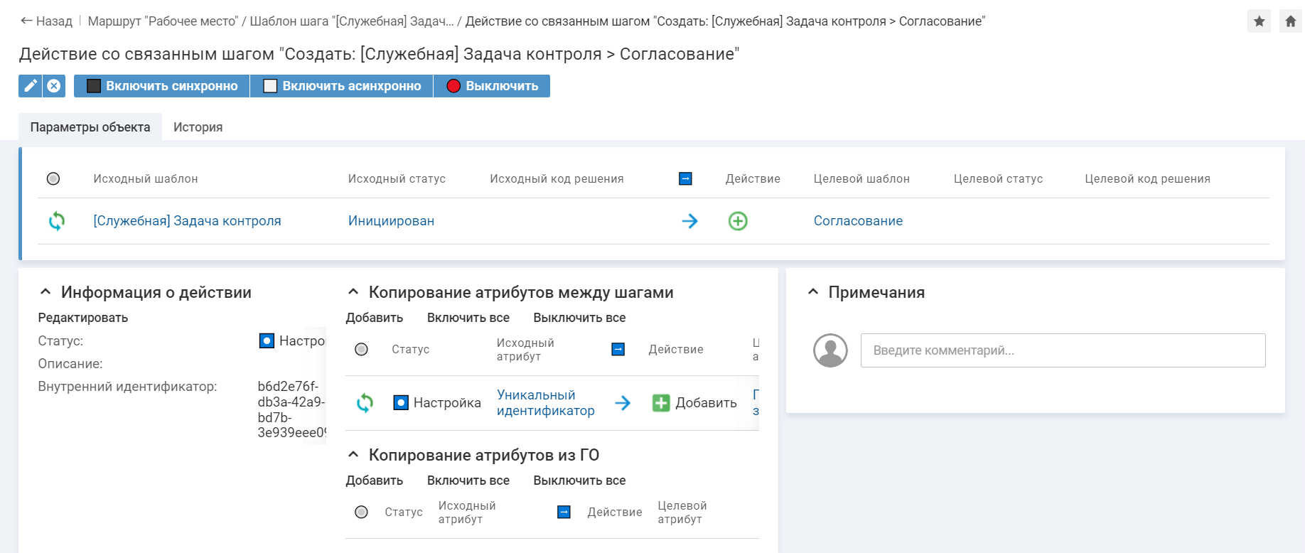 Чтобы настроить копирование атрибутов, на карточке действия со связанным шагом в блоке "Копирование атрибутов между шагами" добавьте объект с параметрами: