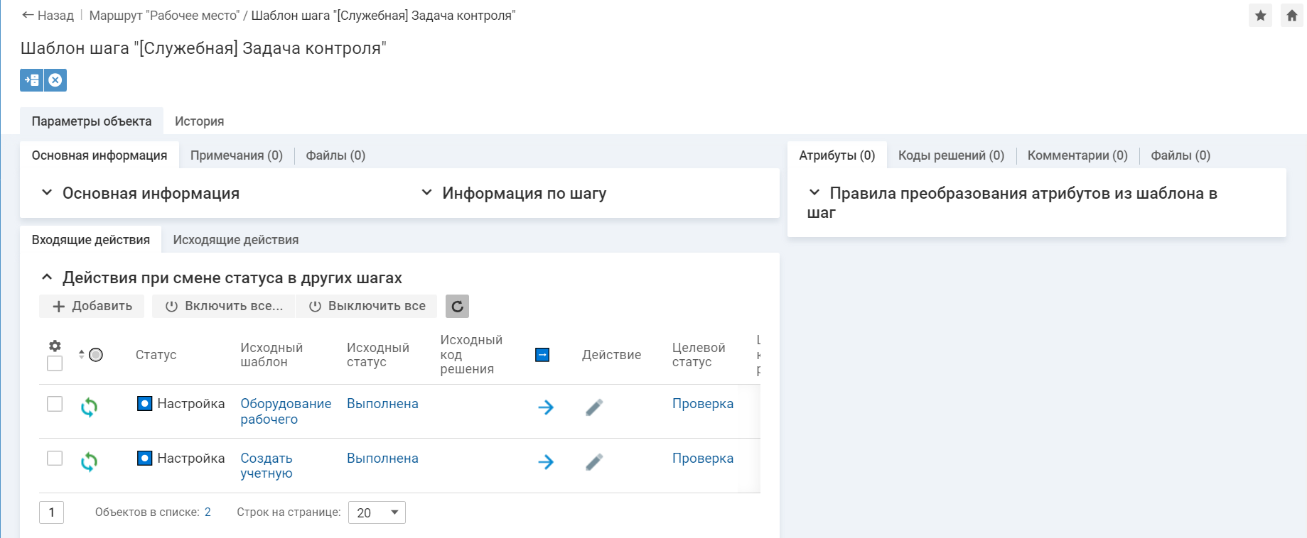 На вкладке "Входящие действия" в блоке "Действия при смене статуса в других шагах" добавьте действия, которые при выполнении каждой из задач маршрута будут переводить задачу контроля в статус "Проверка".