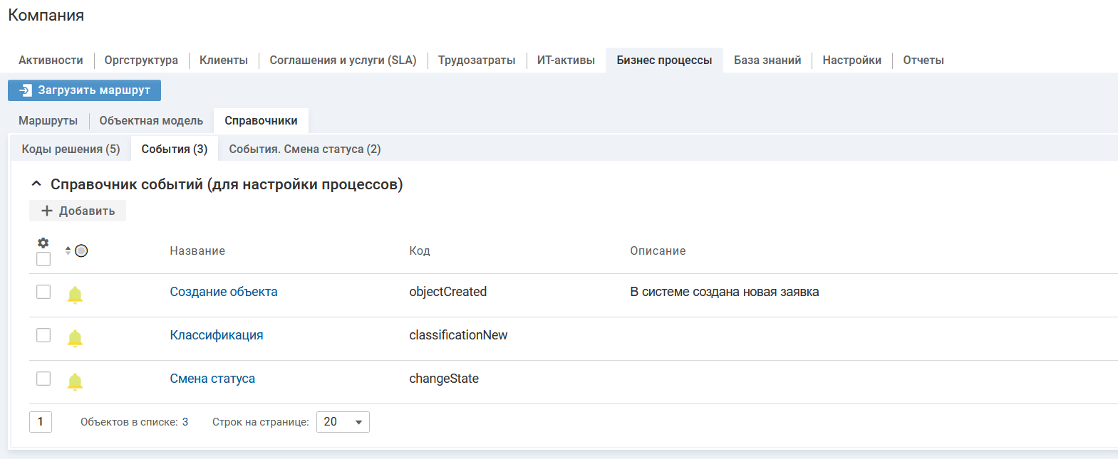 Карточка Компании → Вкладка "Бизнес-процессы" → "Справочники" → "События".