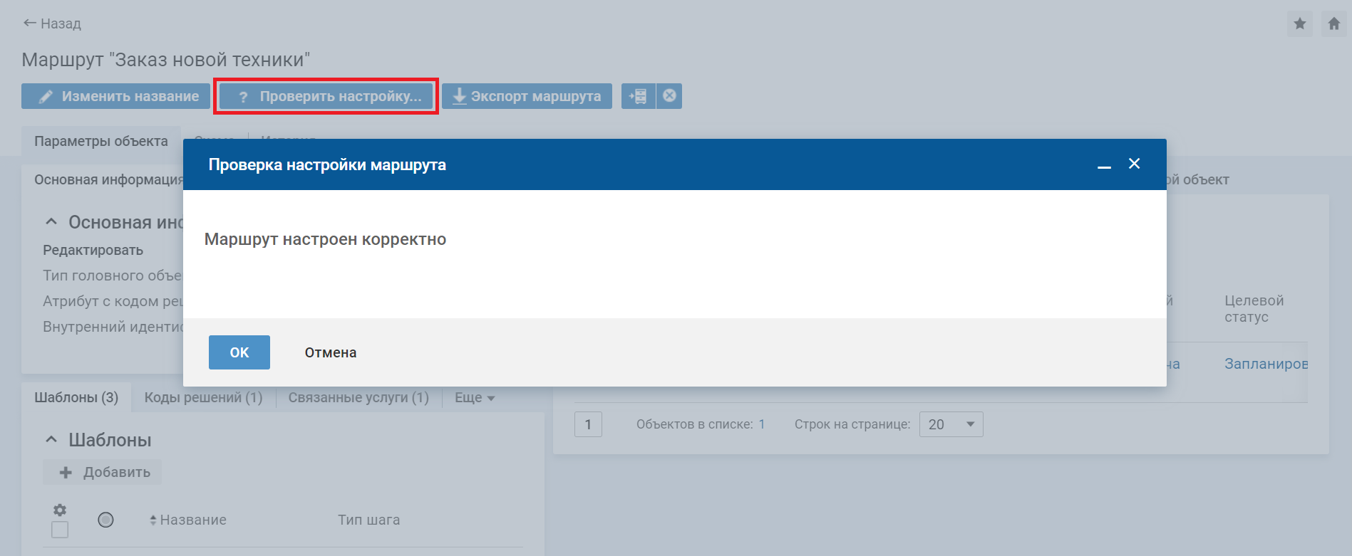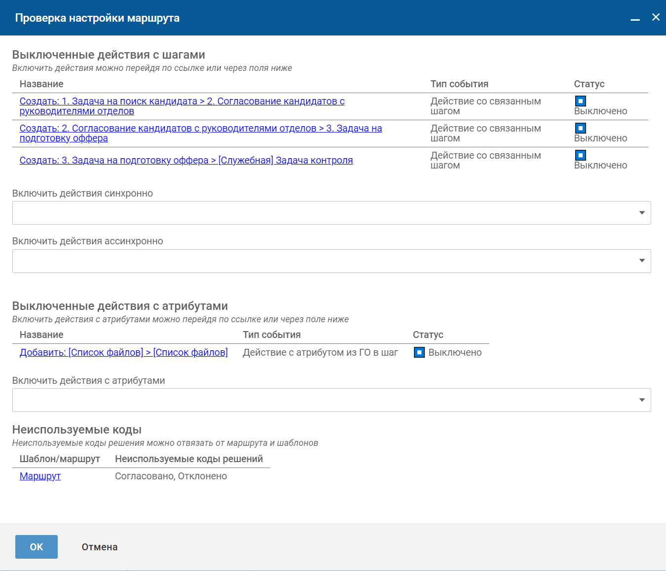 На карточке маршрута нажмите кнопку Проверить настройку. Выполнится проверка, что все действия маршрута включены и используются все коды решений — каждый код хотя бы раз выбран в одном действии.