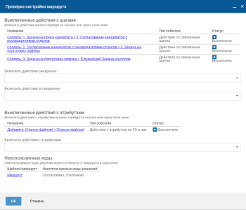 Действия, в которых целевые и исходные атрибуты не соответствуют целевому и исходным типам соответственно — список действий по копированию атрибутов между шагами и головным объектом. Проверяется соответствие исходных и целевых атрибутов действий, которые вложены в основные действия в маршруте.