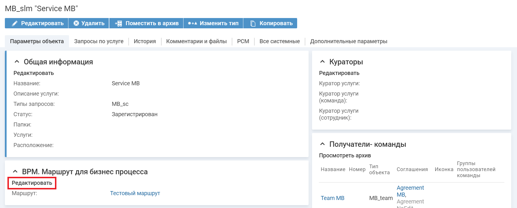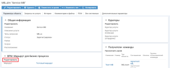 Чтобы связать маршрут с услугой, откройте карточку услуги, нажмите кнопку Редактировать в блоке "BPM. Маршрут для бизнес-процесса", выберите маршрут и нажмите кнопку Сохранить.