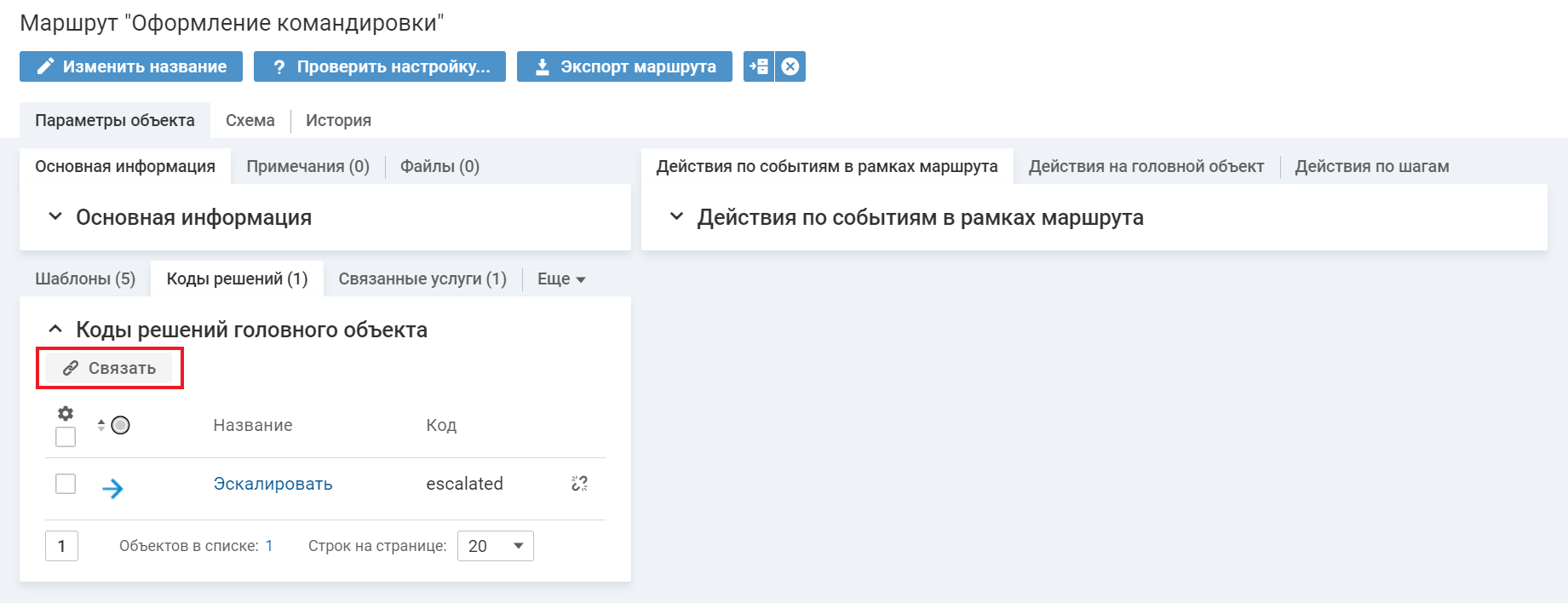 Коды решения, связанные с маршрутом, отображаются в карточке маршрута на вкладке "Параметры объекта" — "Коды решений".