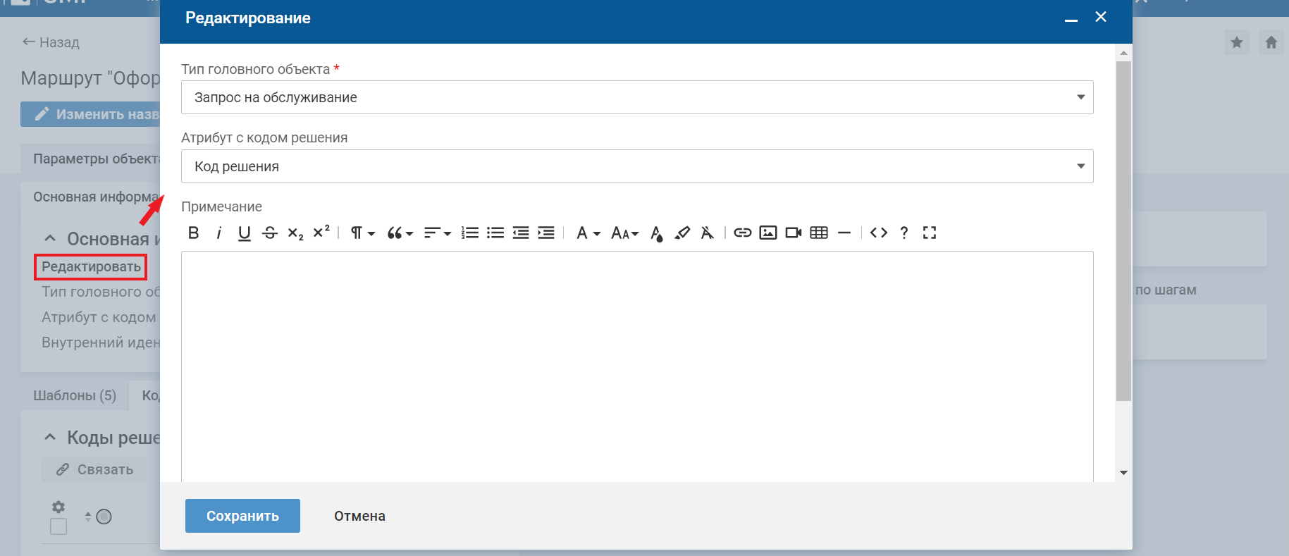 Чтобы в дальнейшем использовать коды решения при настройке действий, в блоке "Основная информация" заполните атрибут "Атрибут с кодом решения". Если головным объектом маршрута является заявка, то таким атрибутом является атрибут "Код решения".