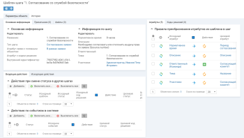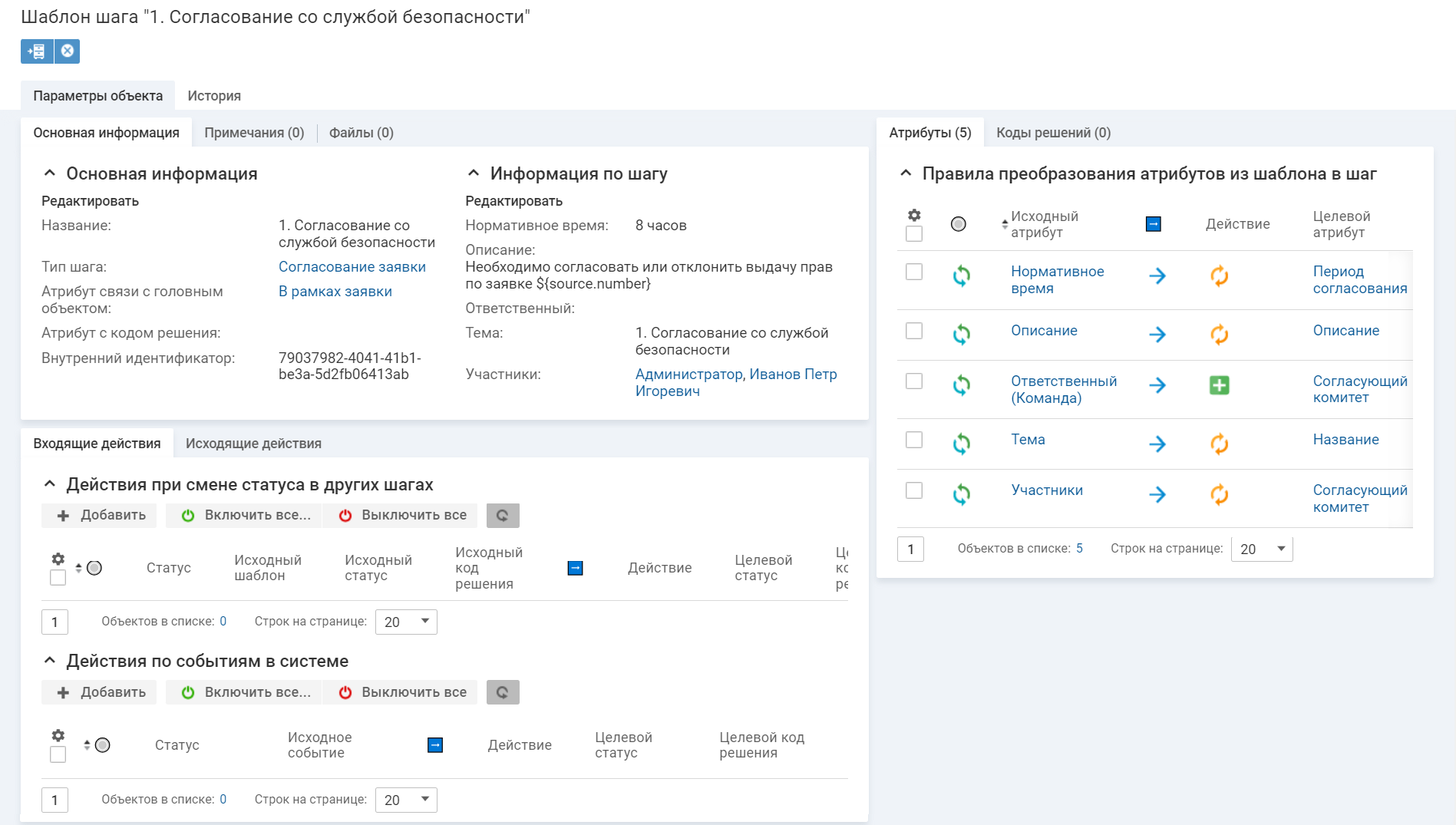 Чтобы настроить действия для шаблона шага, откройте карточку шаблона, на соответствующей вкладке нажмите кнопку Добавить, заполните поля формы добавления и нажмите кнопку Сохранить.