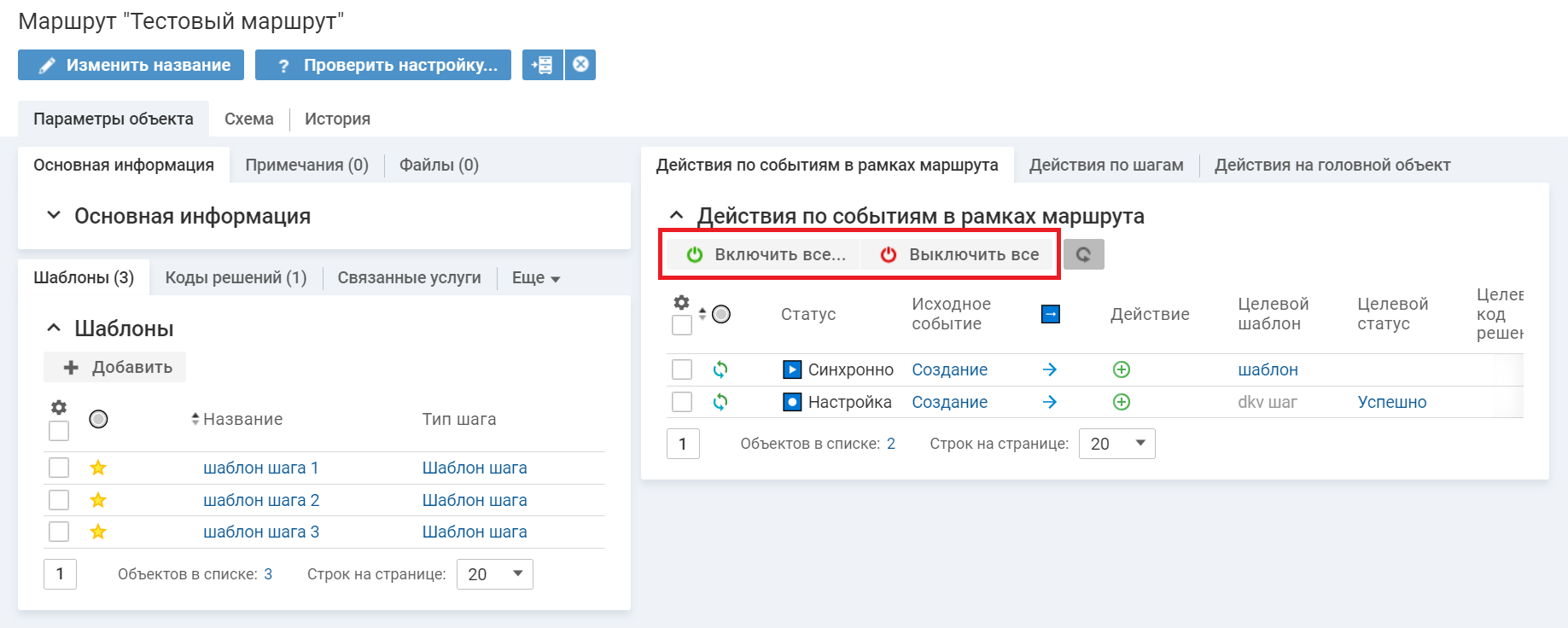 С помощью кнопок Включить все и Выключить все на панели управления списком можно включить или выключить все действия в списке.