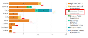 Разбивка — обязательный параметр для выбора атрибута, по которому будет проводиться разбивка столбцов диаграммы (накопление). Значения из этого параметра отображаются в Легенде.