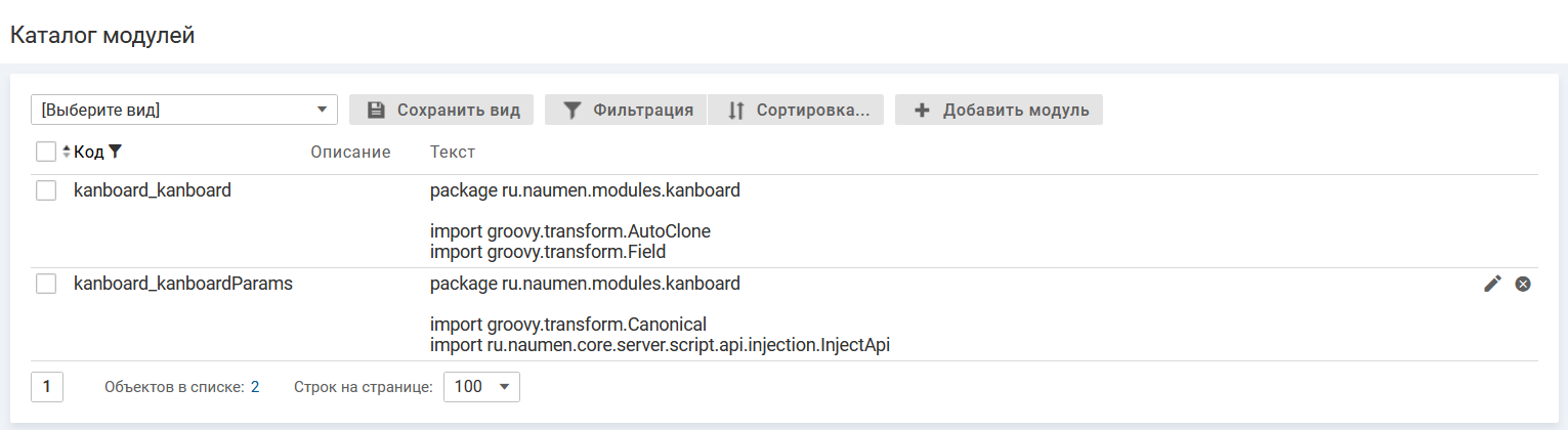 Раздел "Настройка системы" → "Каталог скриптов и модулей" → "Каталог модулей" → Модуль kanboardParams.