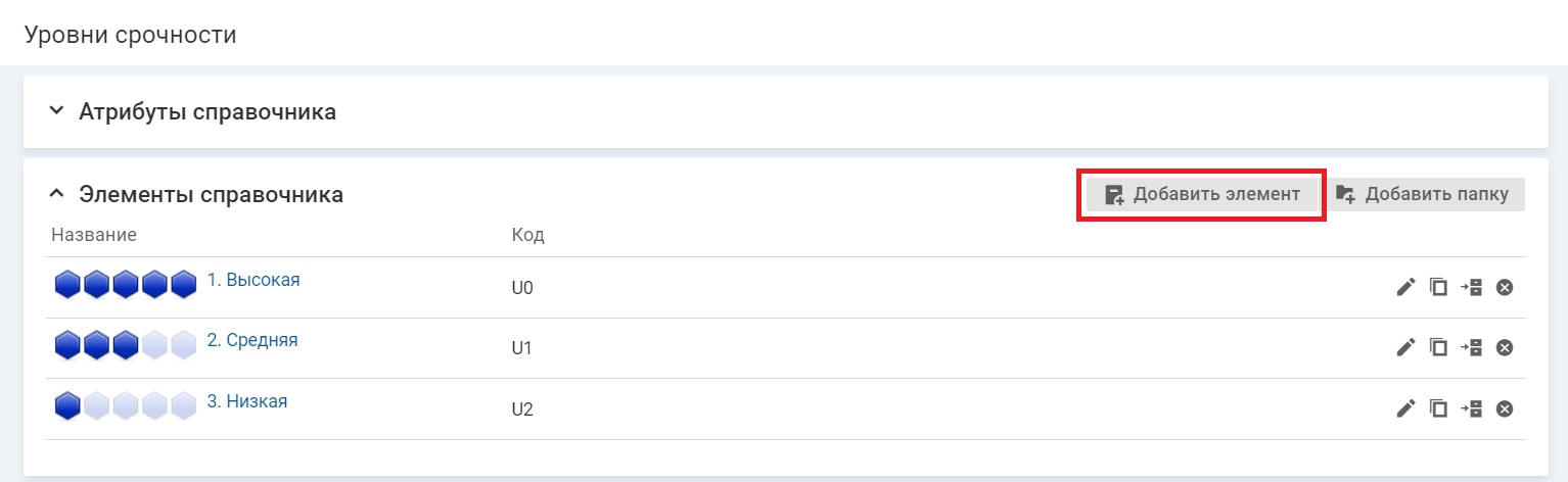 Редактирование, копирование, архивирование и удаление папок и элементов справочника выполняется на странице справочника в блоке "Элементы справочника" или на странице папки или элемента справочника.