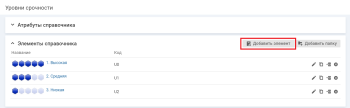 Чтобы добавить элемент справочника, на странице справочника в блоке "Элементы справочника" нажмите кнопку Добавить элемент, заполните поля на форме и нажмите кнопку Сохранить.