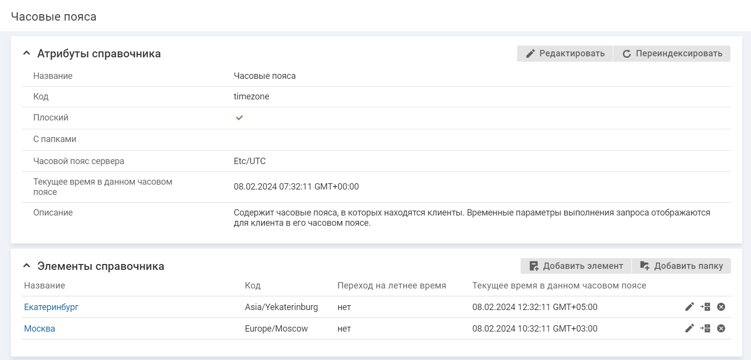 "Элементы справочника" — для каждого часового пояса отображаются: