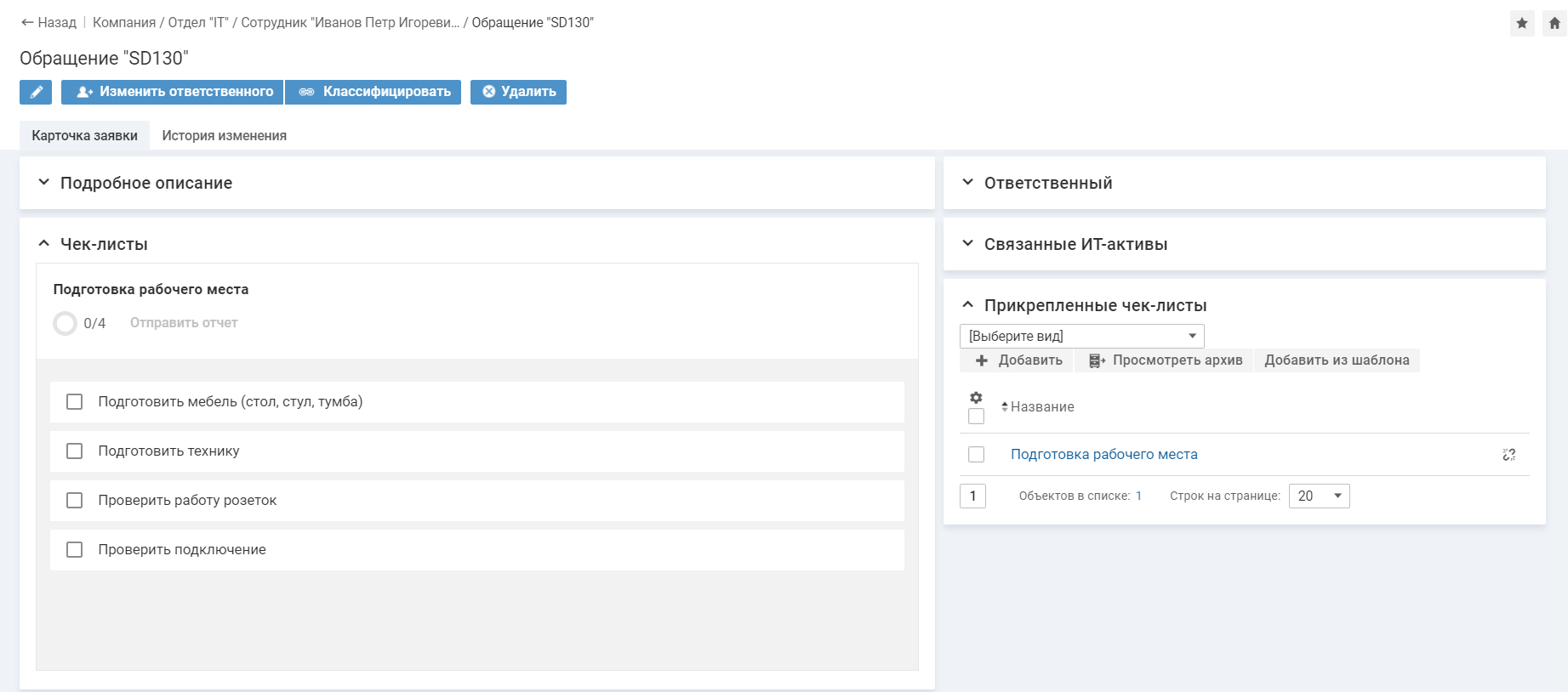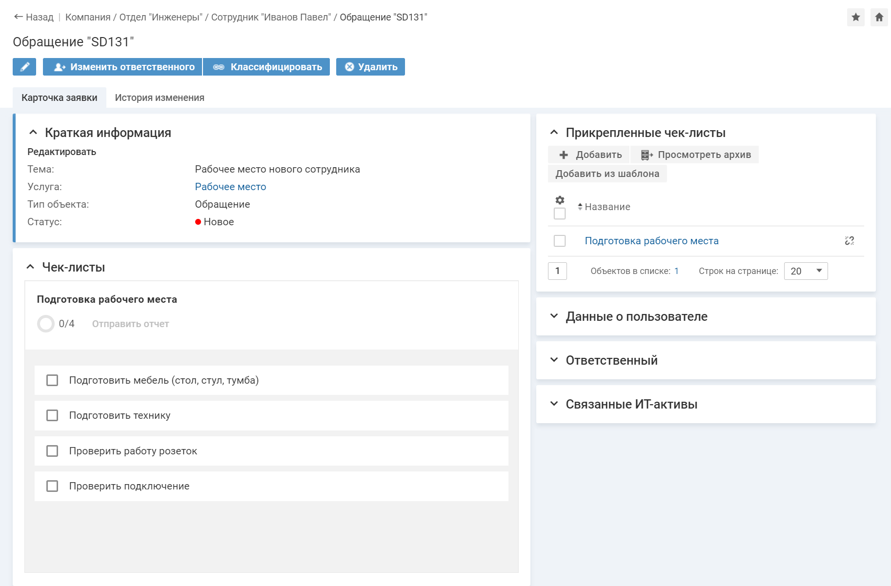 При создании запроса с услугой "Рабочее место", к нему автоматически добавляется чек-лист, созданный на основе шаблона "Подготовка рабочего места".