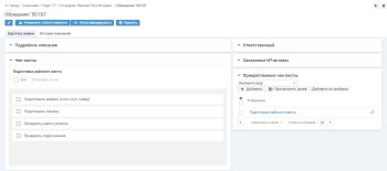 В блоке "Прикрепленные чек-листы" нажмите кнопку Добавить, см. Настройка чек-листов на карточке запроса в веб-интерфейсе.