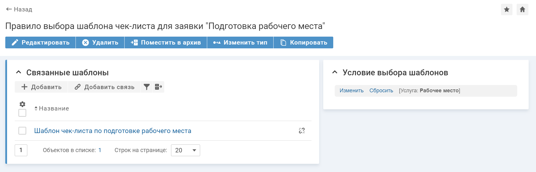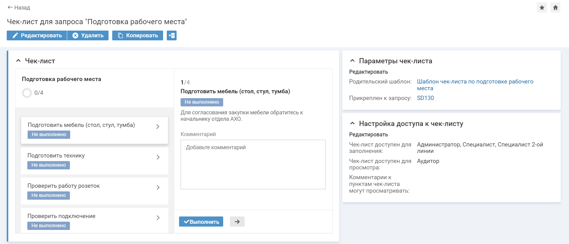 В системе настроен шаблон чек-листа для запроса "Подготовка рабочего места", создано правило выбора шаблона чек-листа для запроса с условием [Услуга: Рабочее место"], настроена связь между ними.