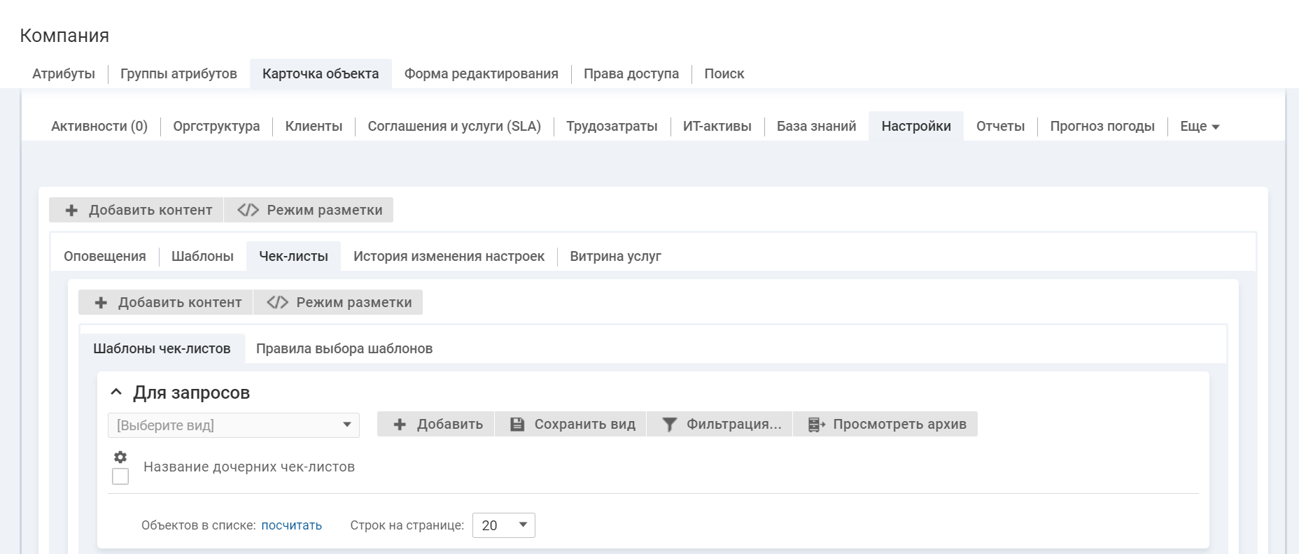 Для отображения шаблонов чек-листов и правил выбора шаблонов в интерфейсе используются контенты со списком объектов.
