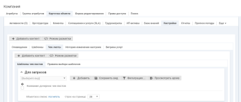 • В карточке компании на вкладке "Настройки" отображается вкладка "Чек-листы", которая содержит списки шаблонов чек-листов и правил выбора шаблонов.