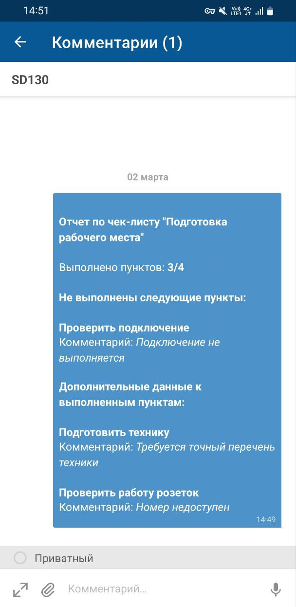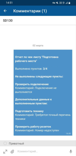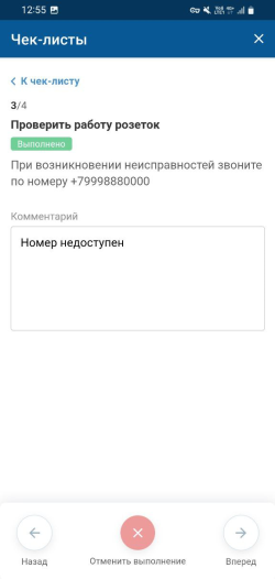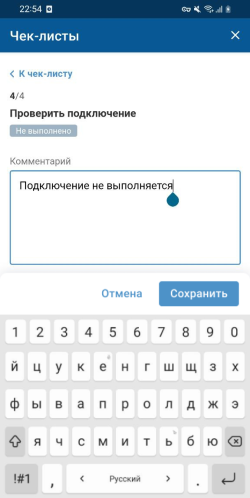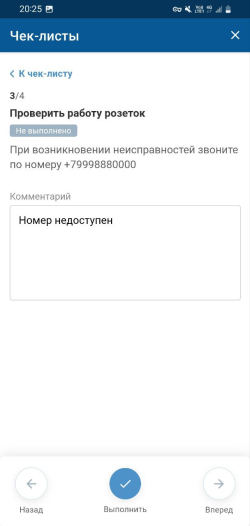 Комментарий также будет сохранен при выполнении пункта, переходе на соседний пункт, возврате к чек-листу или к списку чек-листов, если их несколько.