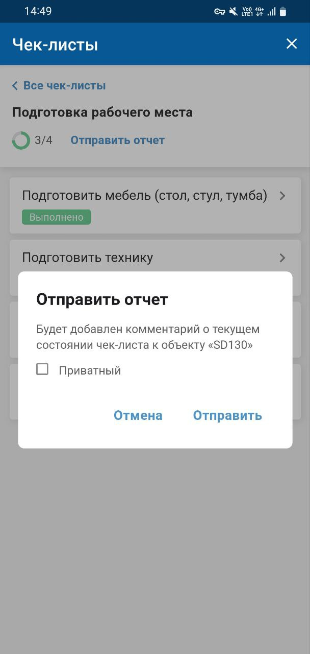 Чтобы добавить отчет, перейдите на экран со списком пунктов чек-листа и нажмите на кнопку Отправить отчет. В окне подтверждения добавления отчета нажмите кнопку Отправить. При наличии соответствующих прав можно задать