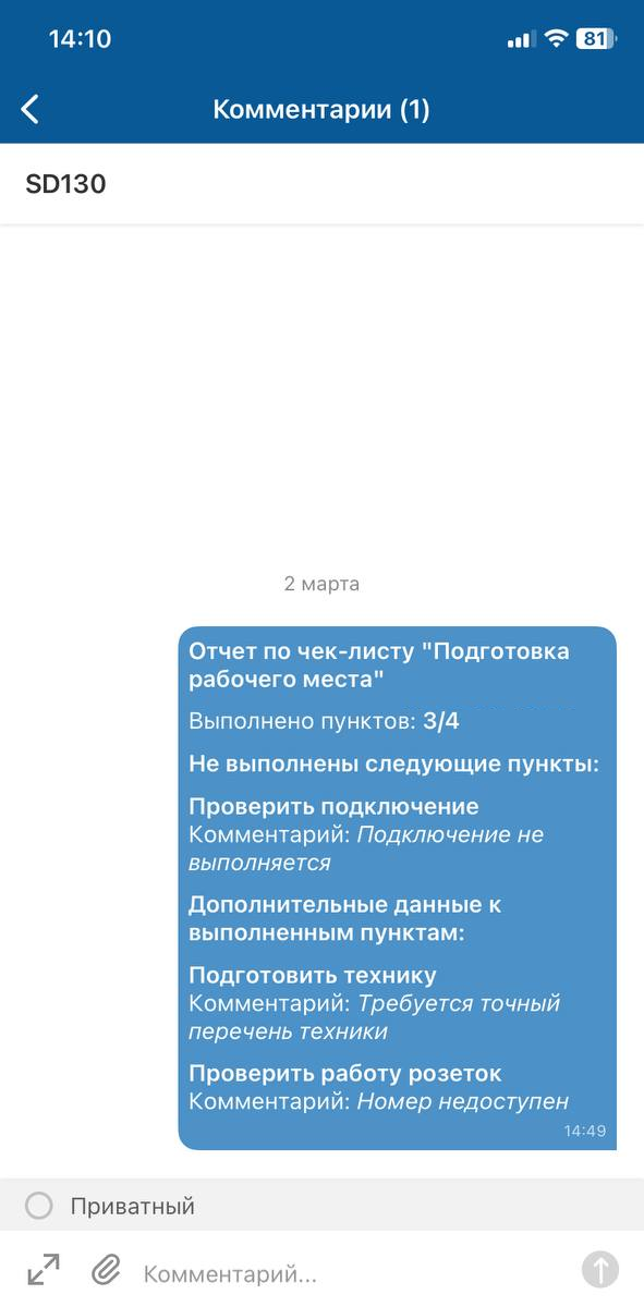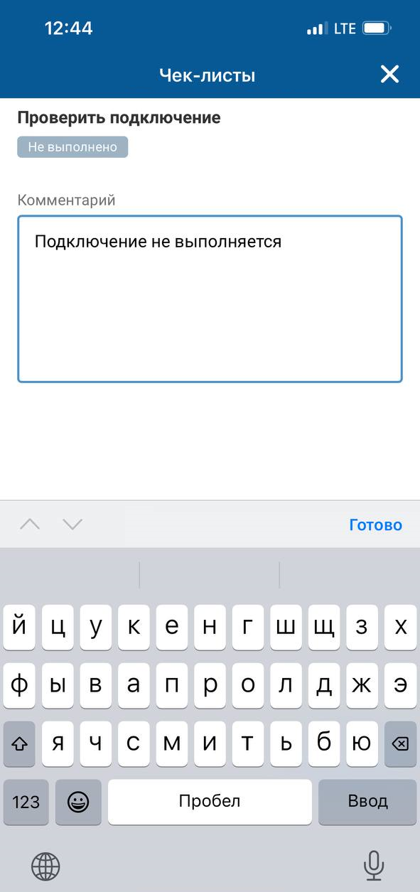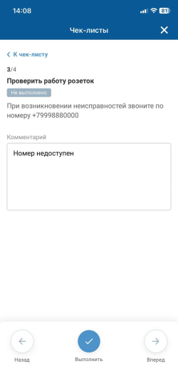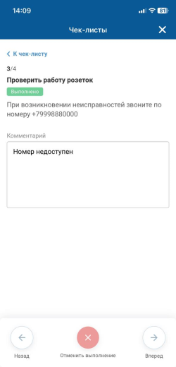Комментарий также будет сохранен при выполнении пункта, переходе на соседний пункт, возврате к чек-листу или к списку чек-листов, если их несколько.