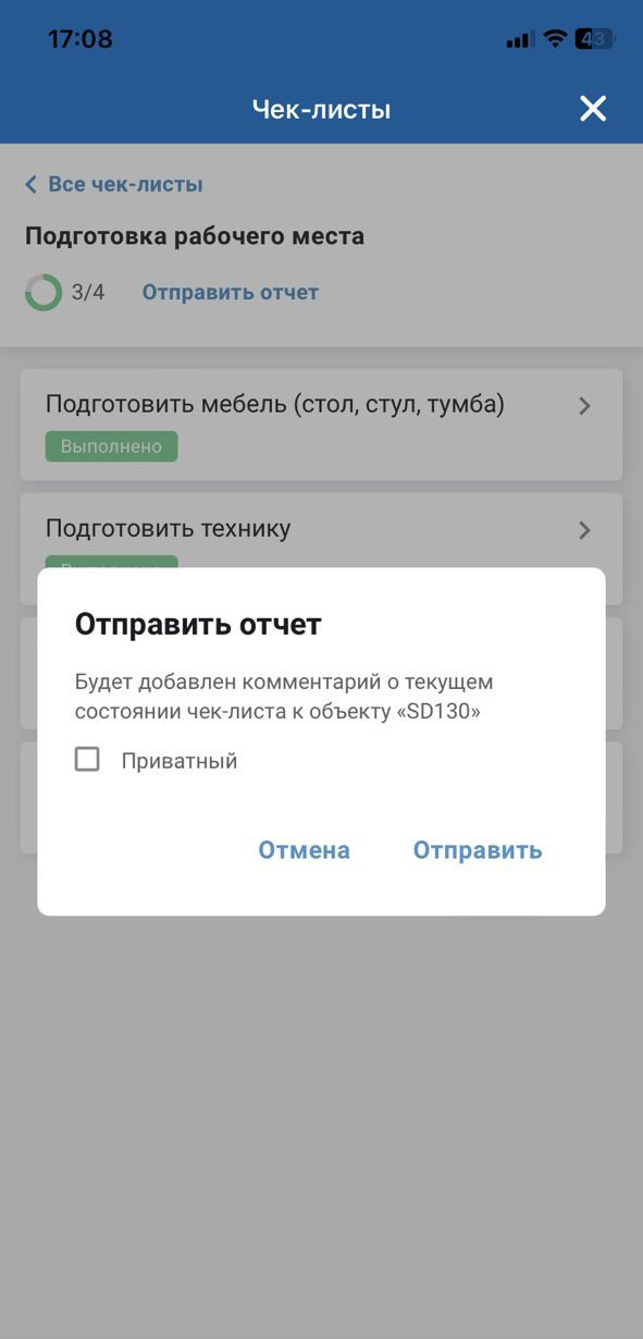 Чтобы добавить отчет, перейдите на экран со списком пунктов чек-листа и нажмите на кнопку Отправить отчет. В окне подтверждения добавления отчета нажмите кнопку Отправить. При наличии соответствующих прав можно задать