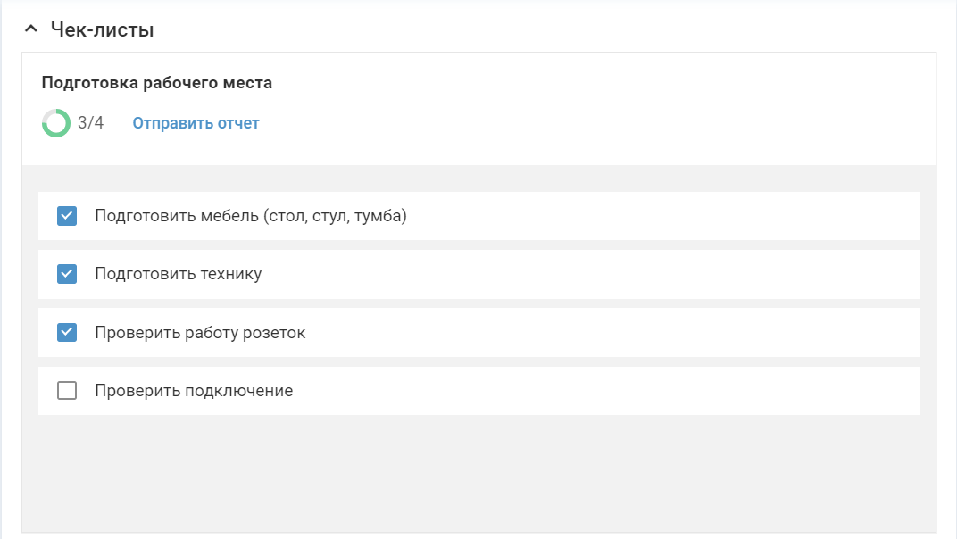 Чтобы отметить пункт, нажмите на него. В пункте установится флажок, значение прогресса по выполнению чек-листа изменится.