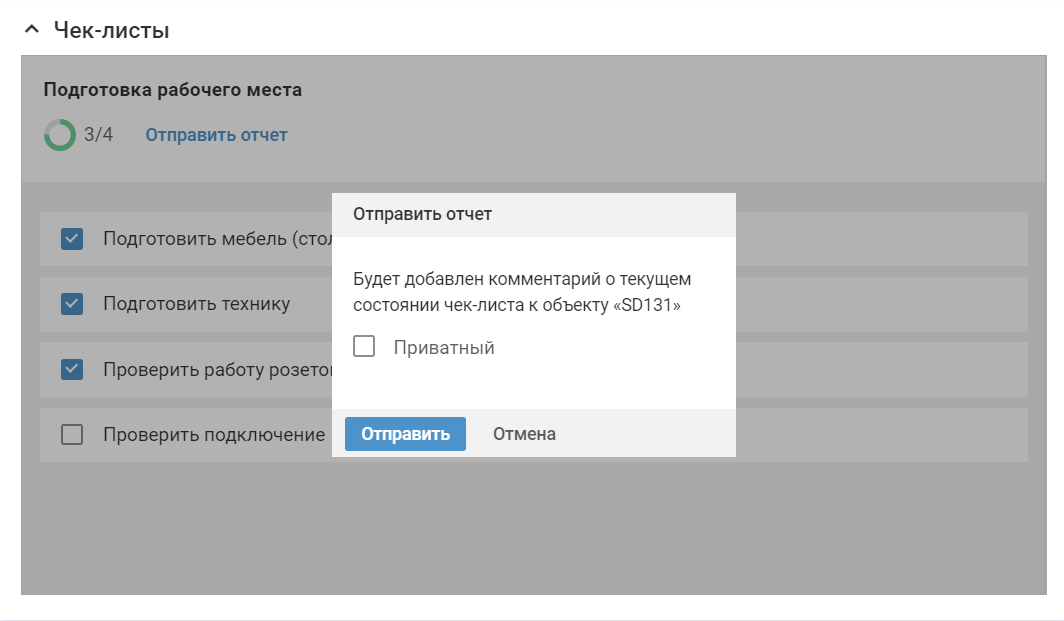Чтобы добавить отчет, нажмите кнопку Отправить отчет в верхней панели чек-листа. В окне подтверждения добавления отчета нажмите кнопку Отправить. При наличии права на добавление приватного комментария можно задать