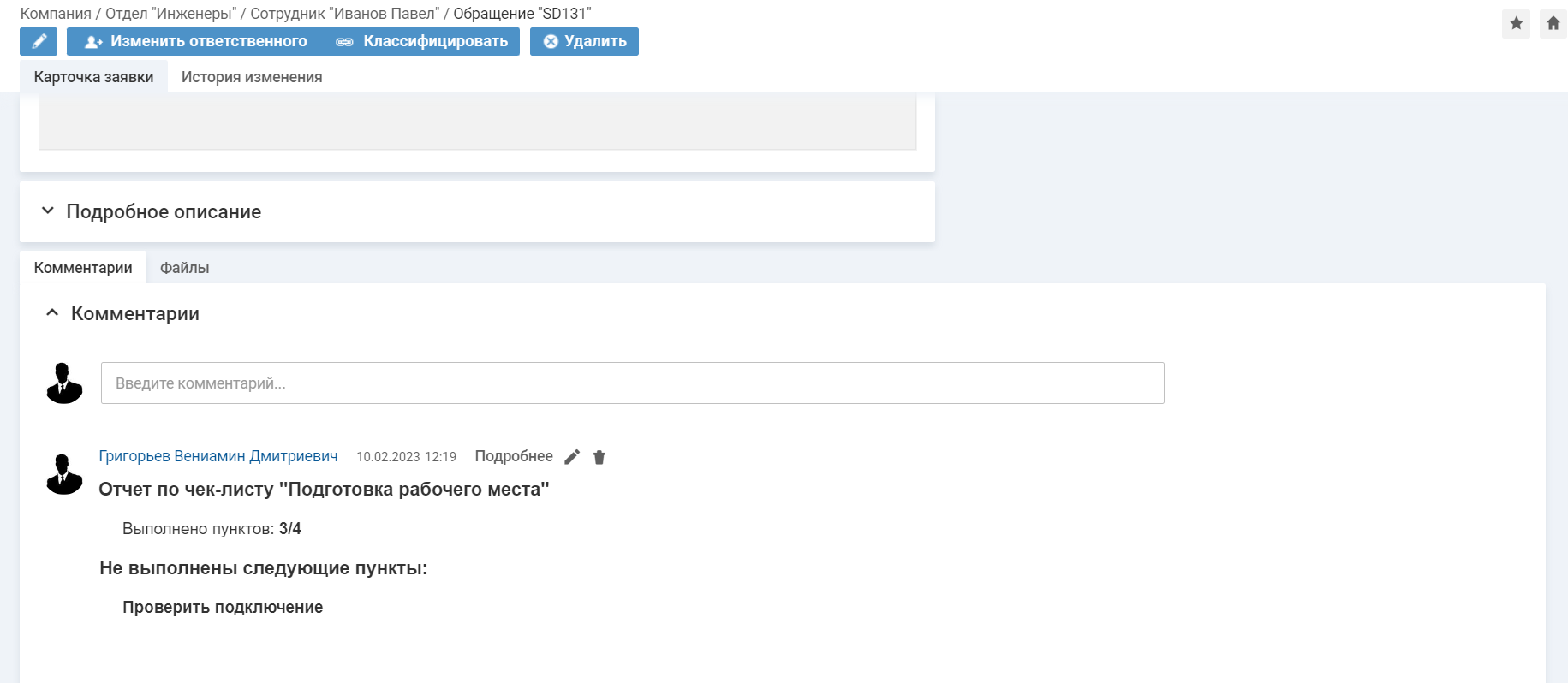 Добавление отчета по чек-листу выполняется при работе с чек-листом на карточке объекта. Отчет добавляется в комментарии к объекту. Отправка отчета на карточке самого чек-листа недоступна.