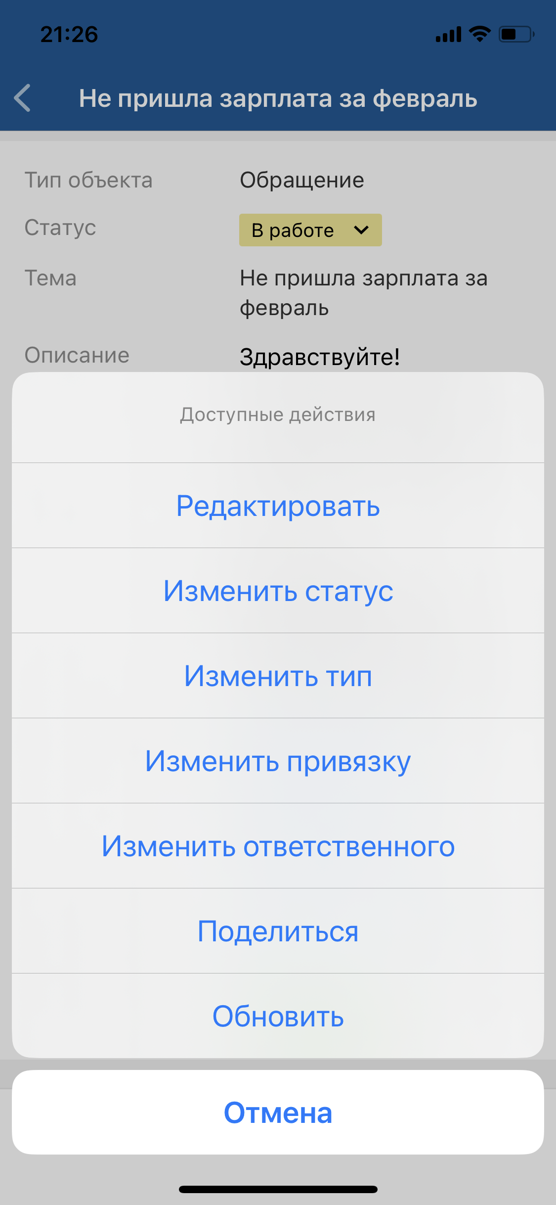 Экран карточки объекта. Действие инициируется в меню действий с объектом