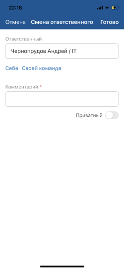 Возможность смены ответственного зависит от настройки мобильного приложения и прав доступа текущего пользователя.