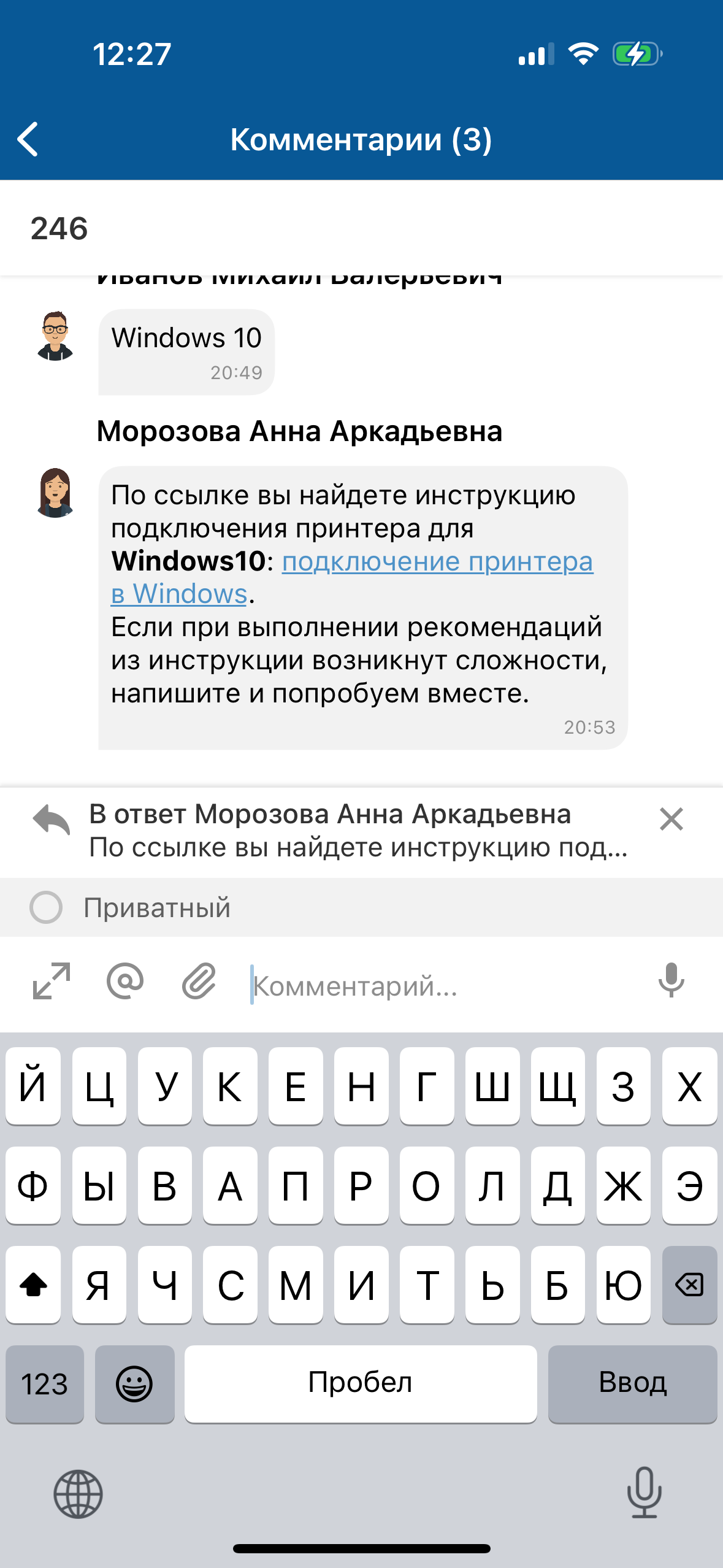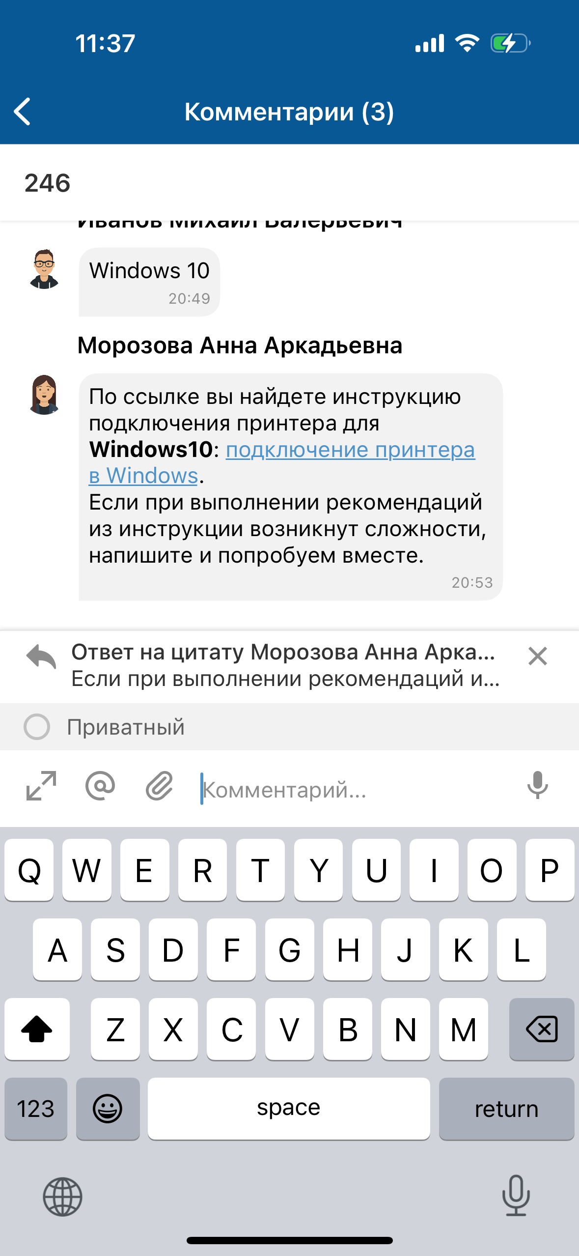 В виджете добавления комментария введите текст ответа, при необходимости укажите приватность ответного комментария, добавьте упоминание и прикрепите файлы. Виджет открывается на том же экране.